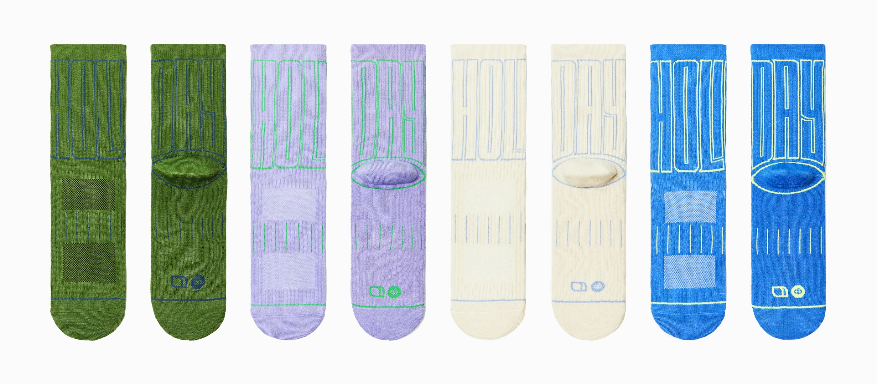 The Holiday Sock design is inspired by the idea of celebrating the little things - the things we often miss and sometimes go unnoticed. The concept of Holiday, Everyday orbits around creating holiday-like moments in your daily life so what better way than to wear a giant, bold reminder on your sock? To keep it true to our inspiration, we made the "HOLIDAY" word so big and so bold that when you wear it, it obscures into a stripe-like pattern. If you know, you know. You know?