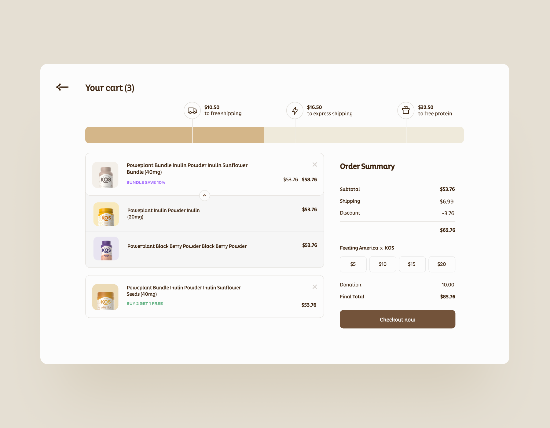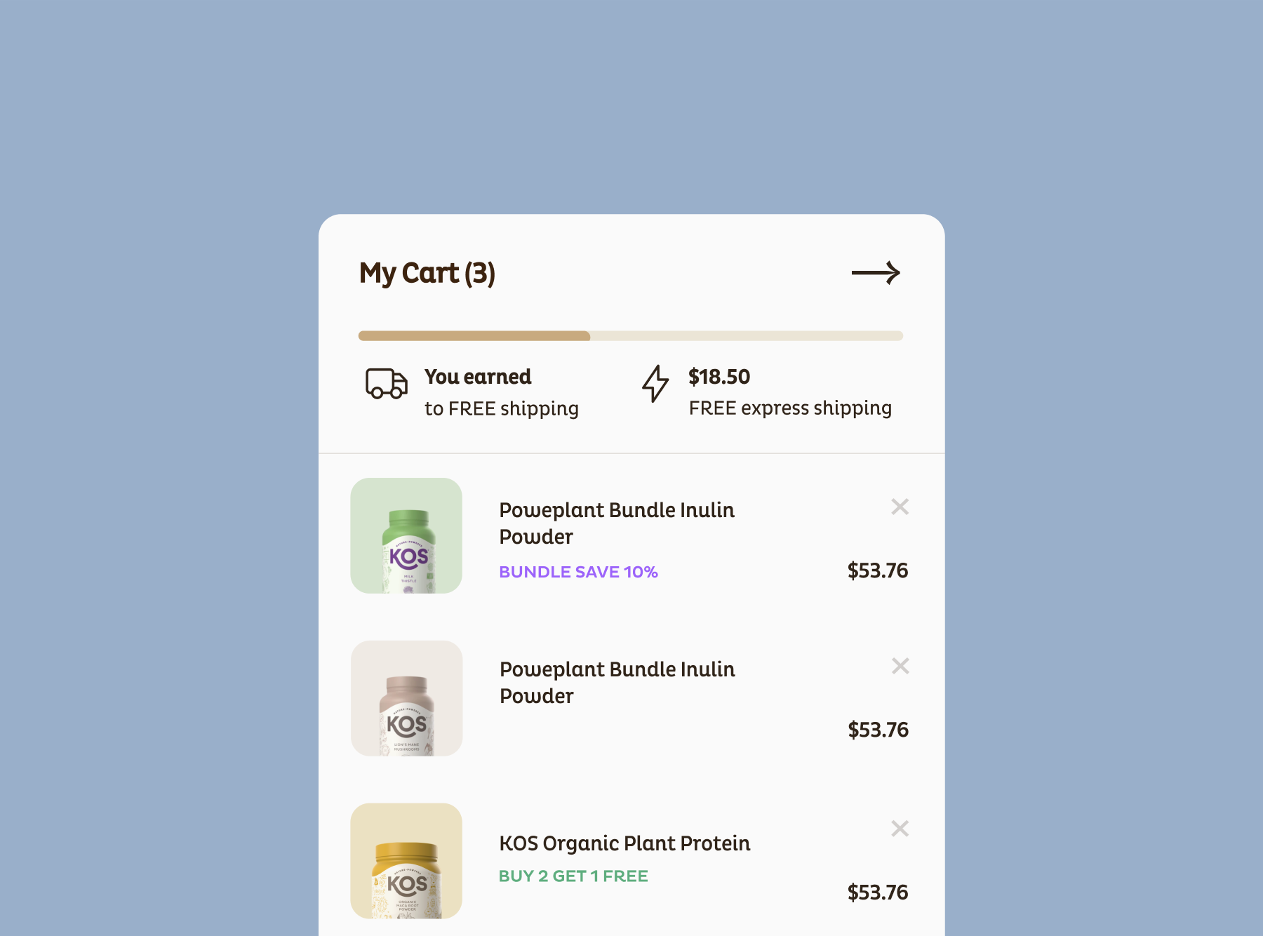 KOS needed an improved cart to accommodate their varied and stacked promotions. It was getting messy and confusing. While it is a small section, it properly challenged our skills as UI designers due to the info overload on such a tiny space. Our solutions is a dropdown to neatly display and label bundle items along with their corresponding promo tags - just like grouped layers - so all promotions and bundles are clean and clear.