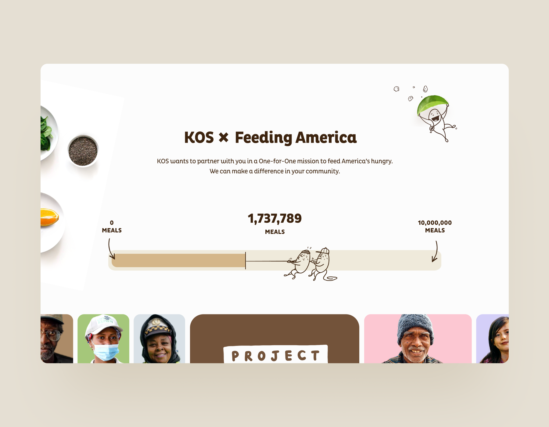 KOS has always had feeding the world as part of their mission. As they move further into realizing this mission, they wanted to highlight one of their main initiatives with Feeding America. It's the "why" that helps customers decide who they want to support so we gave it a grand opening reveal upon scroll - a welcoming gesture to that section so people absolutely can't miss it.