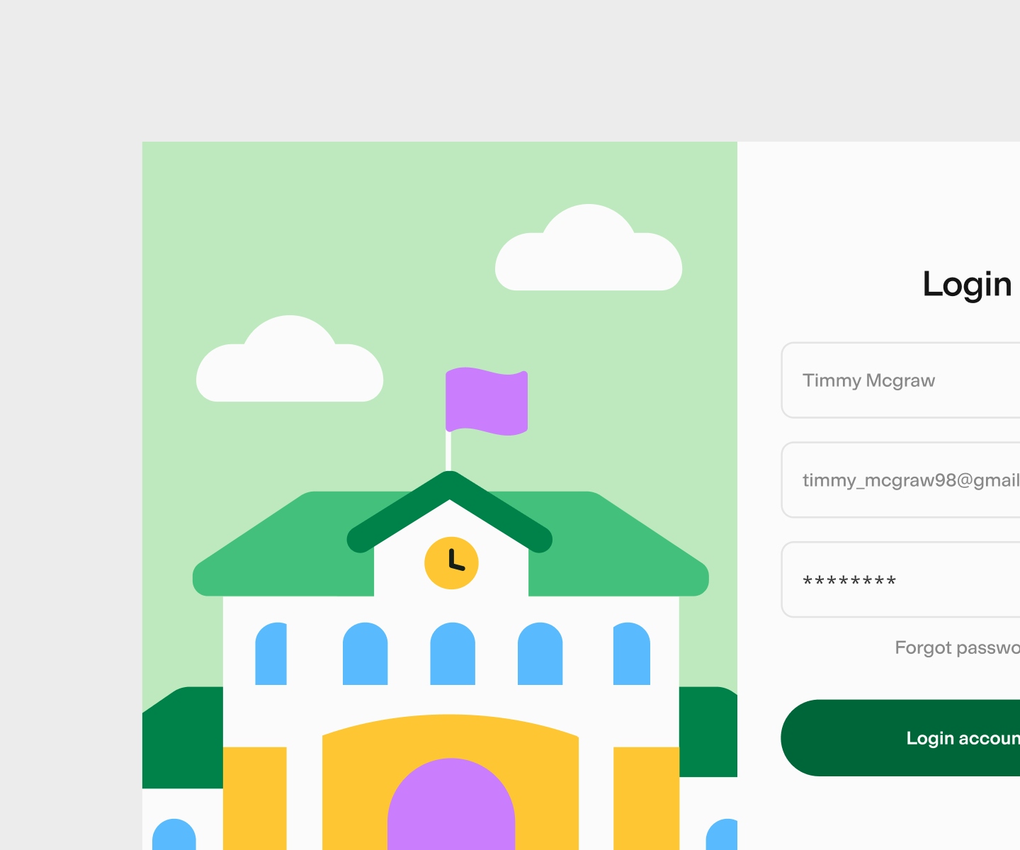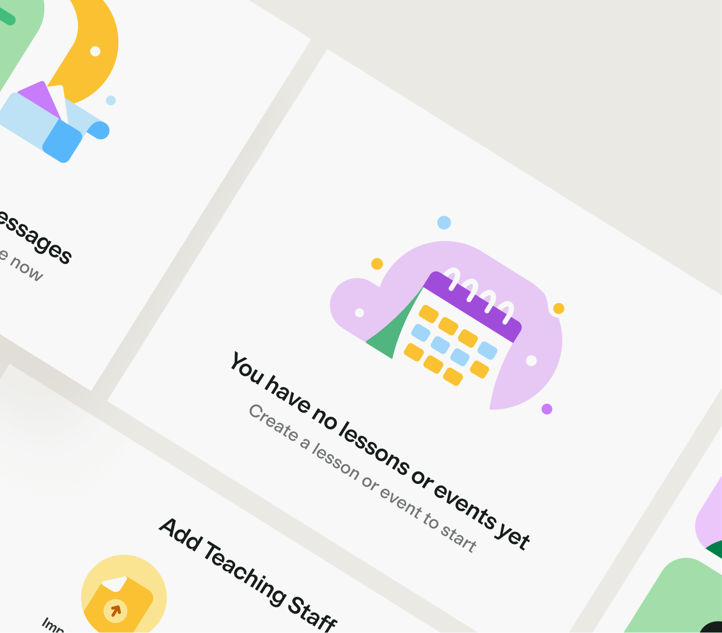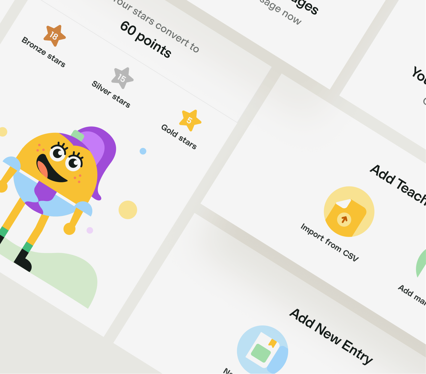There are two things to consider in establishing the illustration style: the general illustrations and the avatar. We had to be mindful of the many age groups we're dealing with - from pupils between 3-12 to adults between 30-65 - ensuring the illustrations were friendly but not childish, carefully toeing the line so a wider audience can still appreciate it. The illustration system is made mostly of basic shapes like circles, and rounded rectangles. This is applied across the board to the characters, objects, and buildings so they all feel like they exist in the same universe.